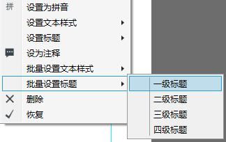 ## 1、右键设置标题(批量设置标题),设置成标题样式的都会在目录上显示(规则没变) 如有不需要在目录上显示的标题,可以设置其他的小标题样式 <div align=center></div> ## 2、拆页问题 ● 设置一级、二级标题会默认拆页(拆页标记不支持手动取消) ● 设置三级标题也默认会拆页(支持手动修改,拆页标记可以取消) ● 设置四级标题默认不拆页(支持手动) <font color=#666666>**拆页的标记就是下图显示的这个红点**</font> <div align=center></div> ## 3、批量拆页或取消 | <div align=center></div> | | :------------: | | 这个就是开始工具栏里拆页的按钮 | ● 某一层级的标题如果没有拆页,那他<font color=#FF0000>下一(几)层级的标题</font>都不能拆页 <font color=#666666> 比如三级标题如果没拆页,那么四级标题肯定是不能拆页的</font> ● 一个标题拆页或不拆页,那么<font color=#FF0000>这一层级的标题</font>都会有相同的操作
